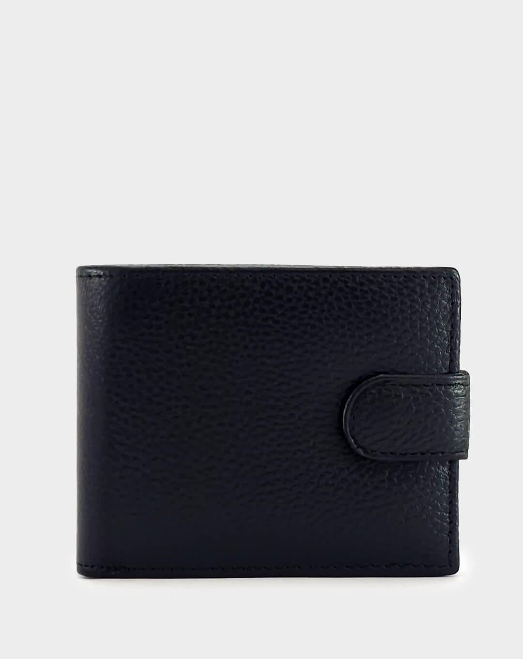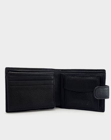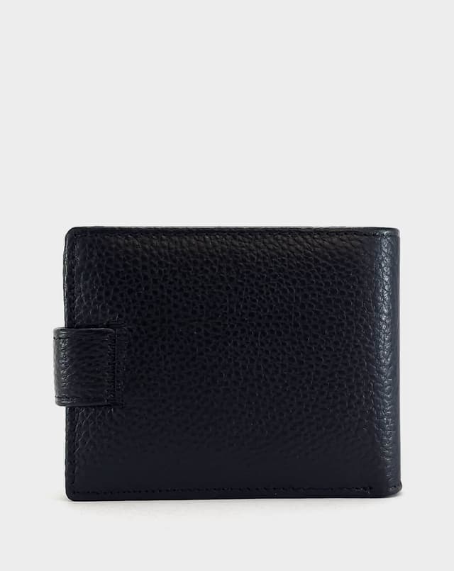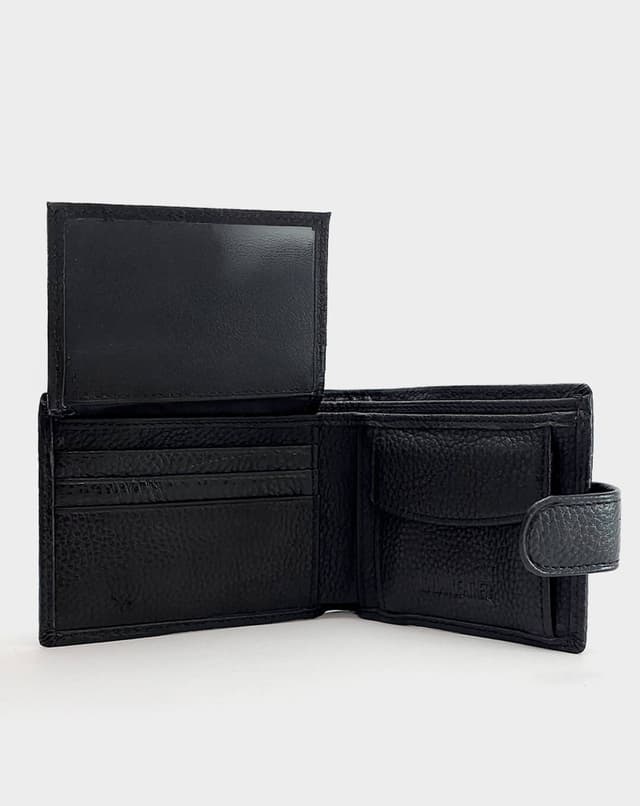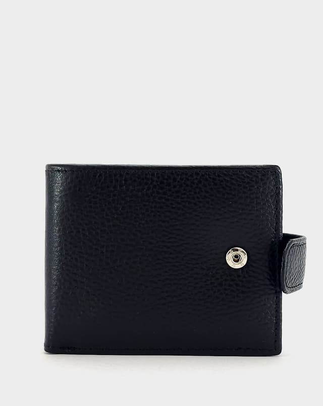Машки паричник од природна кожа во класична црна боја, со фина текстура и едноставен, елегантен дизајн. Располага со практичен внатрешен распоред, вклучувајќи прегради за картички, документи и копчиња, како и транспарентна преграда за лични документи. Надворешното затворање со метална копча обезбедува дополнителна сигурност, а компактниот дизајн го прави совршен за секојдневна употреба.