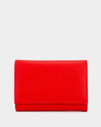 Женски паричник изработен од мазна природна кожа во портокалово-црвена нијанса. Нуди расклоплив дизајн со прегради за картички, фотографии и документи, дополнет со сигурно затворање на копче за практична организација.