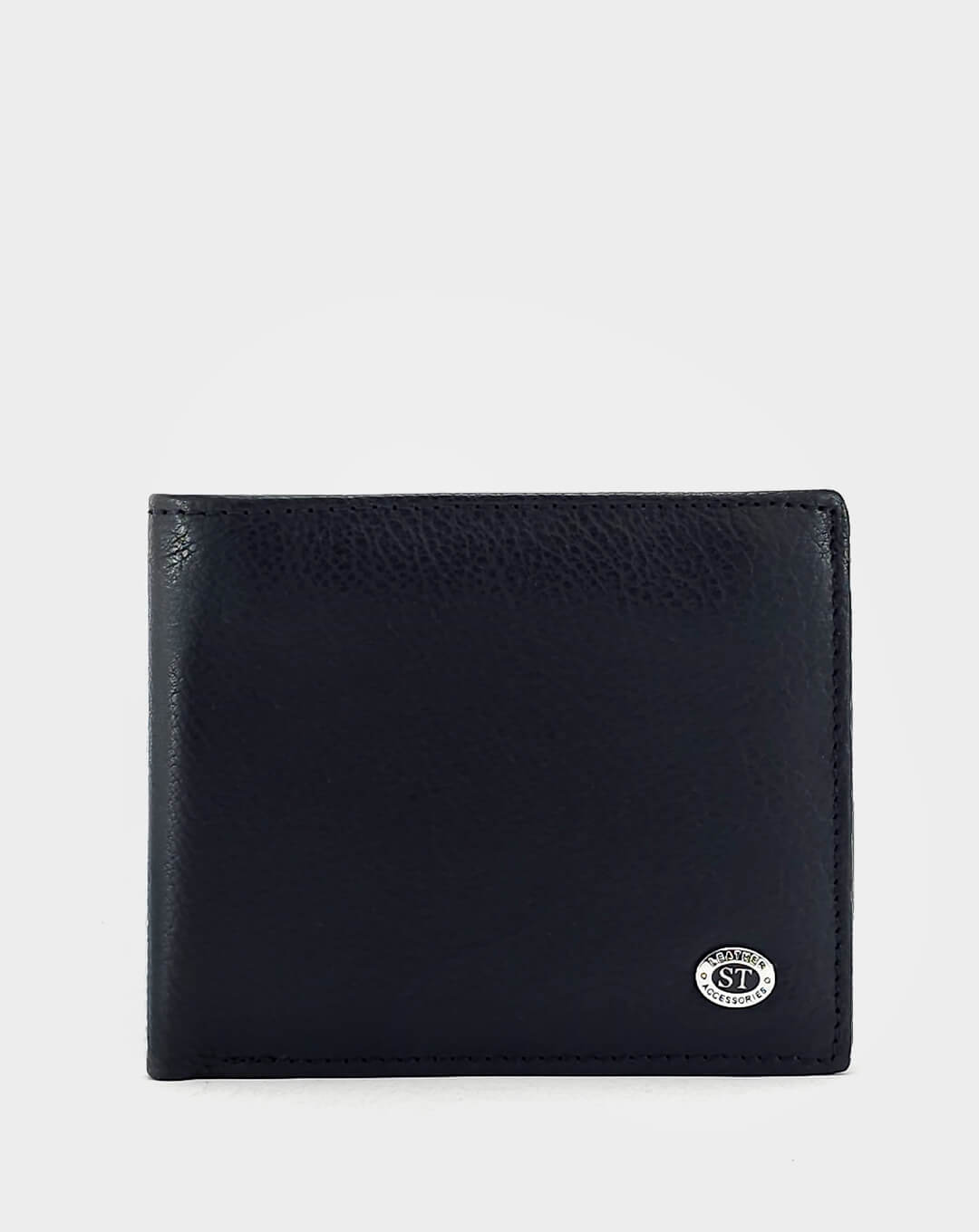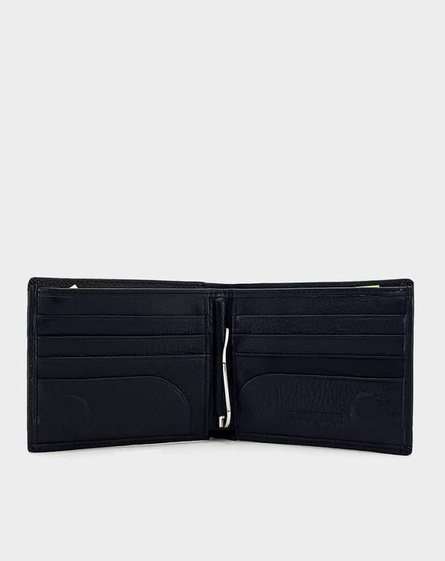 Машки паричник изработен од фина природна кожа во црна боја. Има држач за пари од метал, прегради за картички и е дизајниран за лесен пристап и минималистичка употреба.