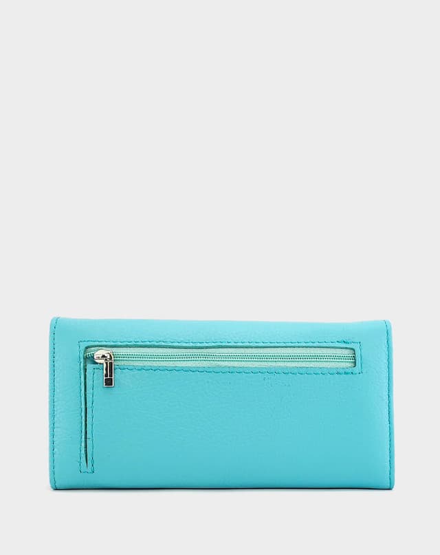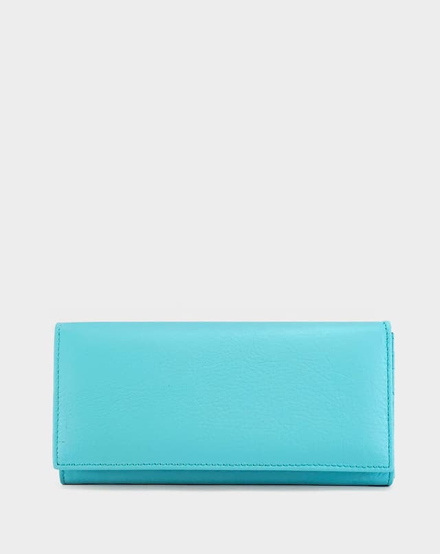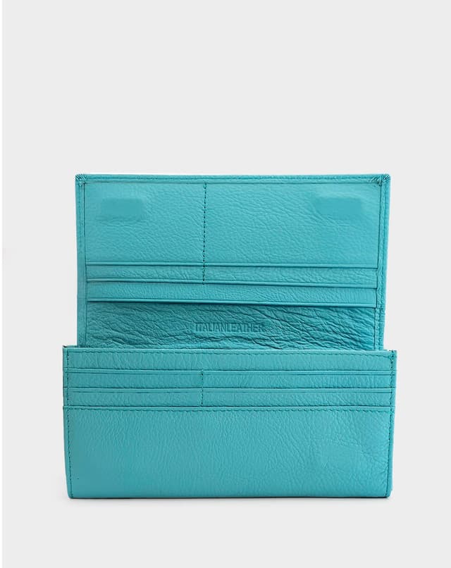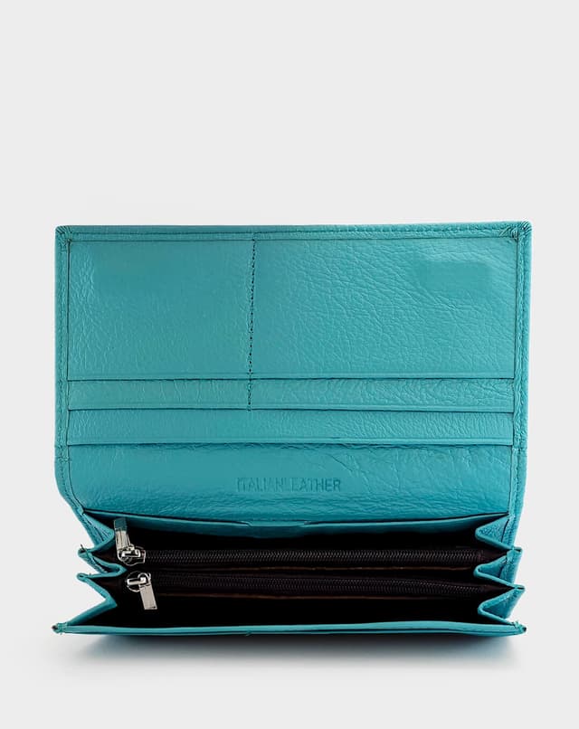 Женски паричник изработен од висококвалитетна природна кожа во светло сина нијанса. Располага со повеќе прегради за картички, документи и патент за монети, совршен за организирано секојдневие.