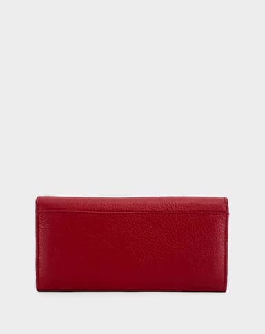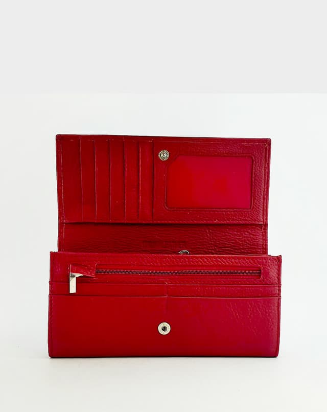 Женски паричник изработен од природна кожа во смела црвена нијанса. Располага со повеќе прегради за картички, проѕирен дел за документи и двоен внатрешен патент, идеален за практична организација со стил.