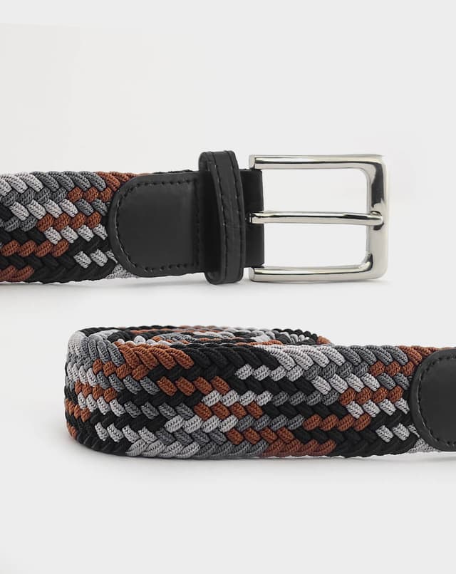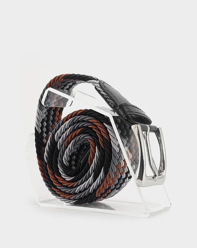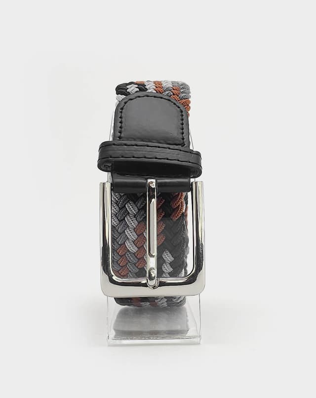 Машки еластичен ремен со префинет плетен дизајн во црна, сива и кафеава нијанса, збогатен со фини кожни детали и сјајна метална тока. Благодарение на флексибилната структура без фиксни дупки, овозможува прецизно прилагодување и врвна удобност при носење. Идеален избор што внесува доза на елеганција и удобност во секој изглед.