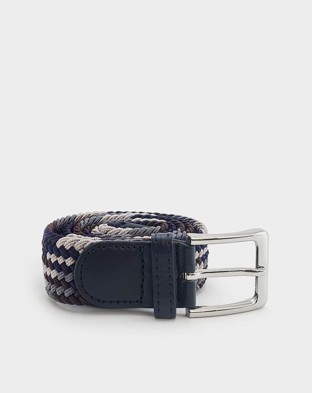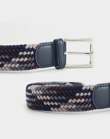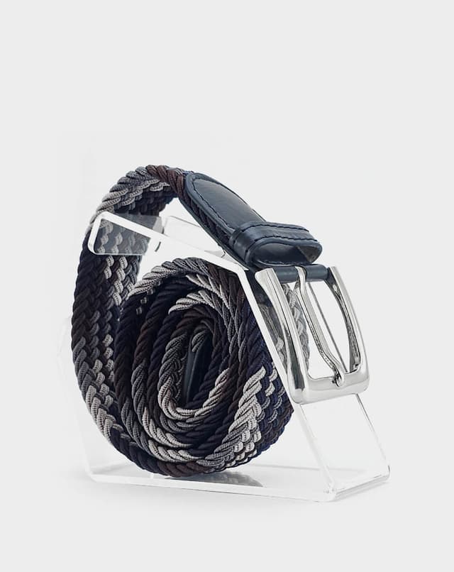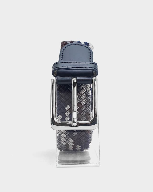 Машки еластичен ремен со префинет плетен дизајн во комбинација од тегет, сива и кафеава нијанса, збогатен со фини кожни детали и сјајна метална тока. Благодарение на флексибилната структура без фиксни дупки, овозможува прецизно прилагодување и врвна удобност при носење. Идеален избор што внесува доза на елеганција и удобност во секој изглед.