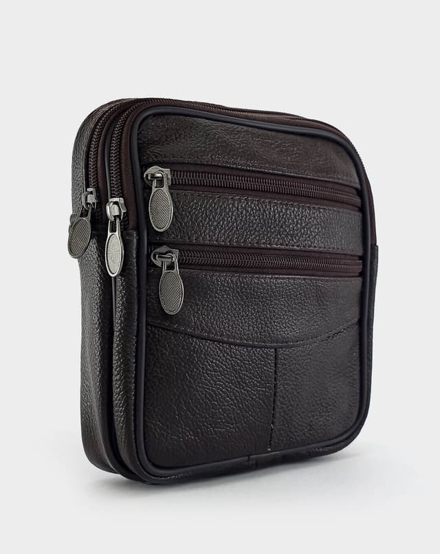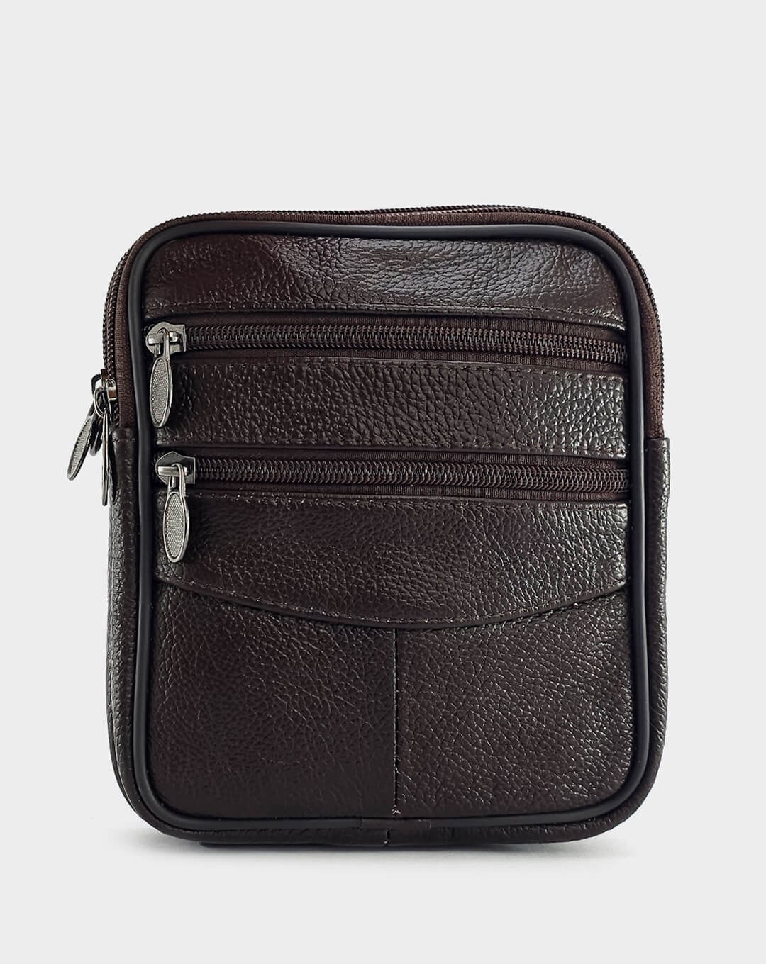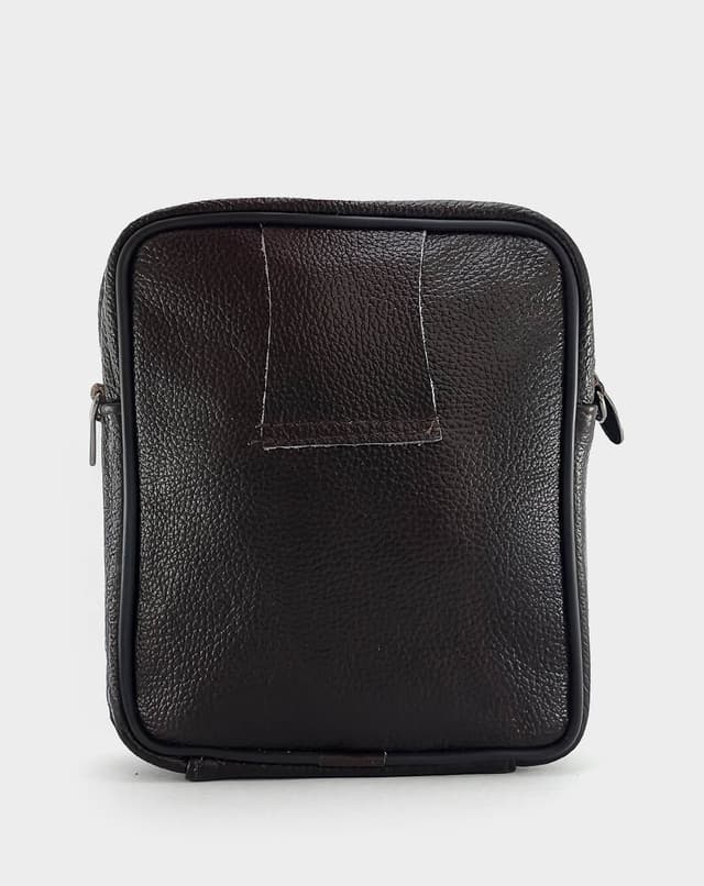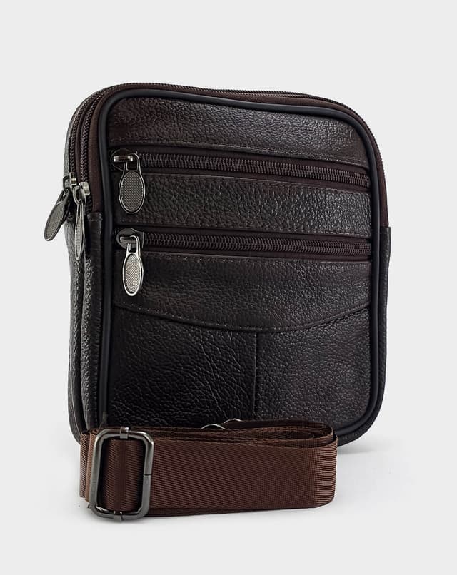 Машка чанта изработена од текстурирана природна кожа во кафена нијанса. Располага со повеќе прегради со метални патенти, овозможувајќи прегледна организација и лесен пристап до секојдневните потреби. Компактна, практична и идеална за динамичен животен стил.