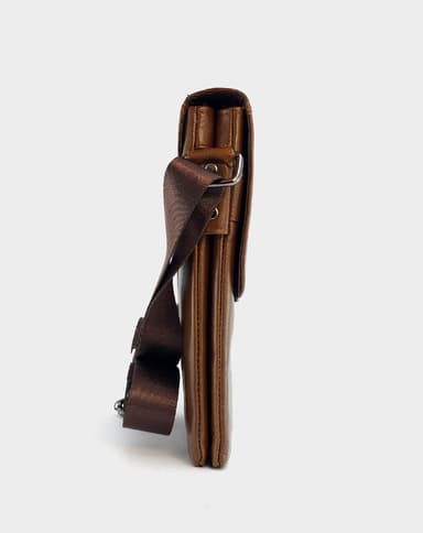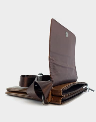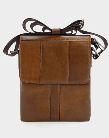 Машка чанта од природна кожа во топло кафеава нијанса, со рамен и минималистички дизајн. Се отвора со капаче на магнет и содржи две главни прегради со патент и долг прилагодлив ремен за носење преку рамо. Совршен избор за секојдневни потреби со дискретен стил.
